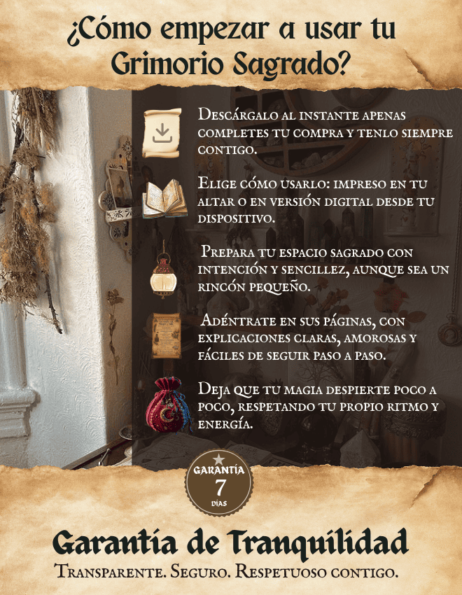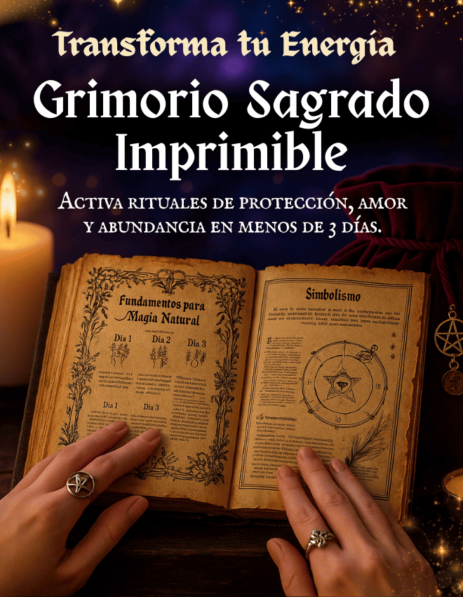 Imprimí el Grimorio y armé mi primer altar simple con velas blancas y cuarzos. Dormí en paz después de semanas. Más que un libro: guía real para el día a día.